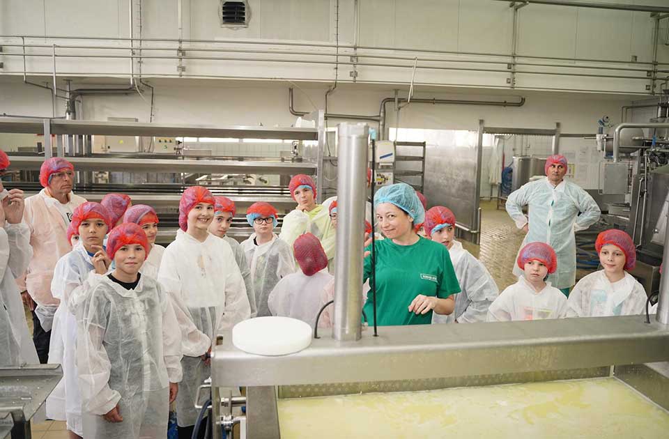 Sa farme su se, puni utisaka, zajedno sa tehnolozima i majstorima za sir u Mlekoproduktu uputili ka proizvodnom pogonu i magacinu za zrenje sireva gde su, uz kratku edukaciju o procesu nastanka sira, mogli da vide i kako se proizvode tradicionalni polutvrdi sirevi u ovoj kompaniji.