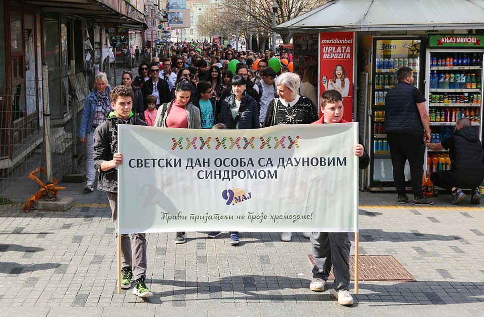Šarena kolona je prodefilovala Ulicom kralja Aleksandra Karađorđevića noseći transparente sa porukama podrške osobama sa Daunovim sindromom, da bi na samom kraju šetnje ka nebu poletelo mnoštvo šarenih balona.