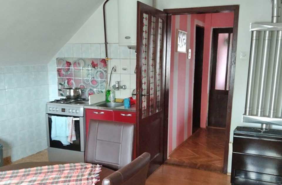 U potkrovlje se penje lepim drvenim stepeništem. Tamo se nalaze dve spavaće sobe, kao i kuhinja spojena sa trpezarijom.