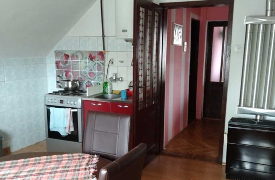 Do potkrovlja vodi drveno stepenište. U potkrovlju su dve spavaće sobe, kuhinja spojena sa trpezarijom i još jedna dnevna soba koja ima izlaz na terasu. Kupatilo u potkrovlju je sa tuš kadom.