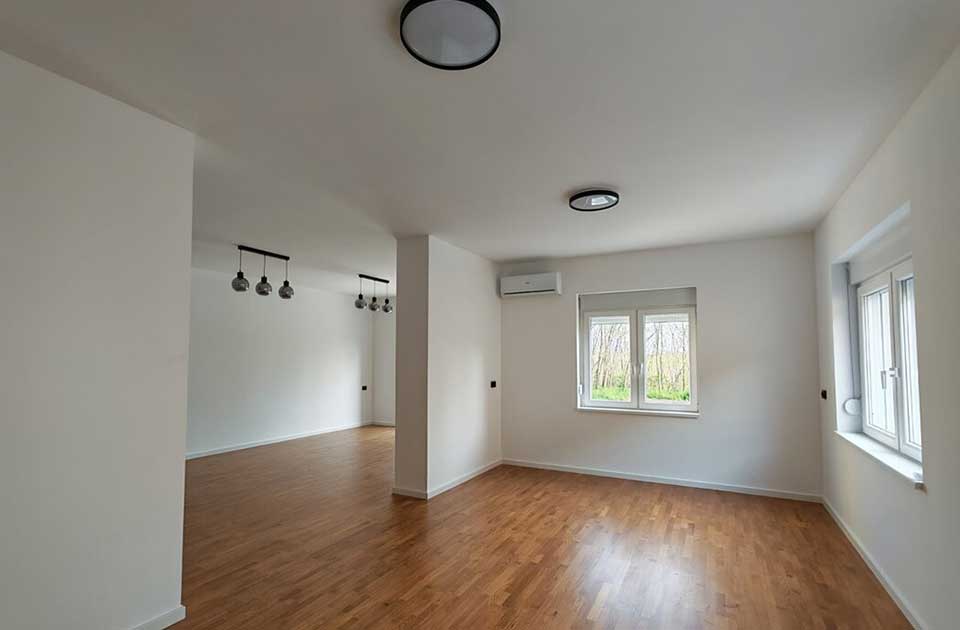 U prizemlju kuće nalaze se prostrani hodnik iz kog se ulazi u sve prostorije, komforan dnevni boravak sa kuhinjom i trpezarijom i izlazom na balkon, gostinska soba, kupatilo i prostorija od 16 kvadrata, koja se može koristiti kao vešernica ili kancelarija, u zavisnosti od potrebe novog vlasnika.