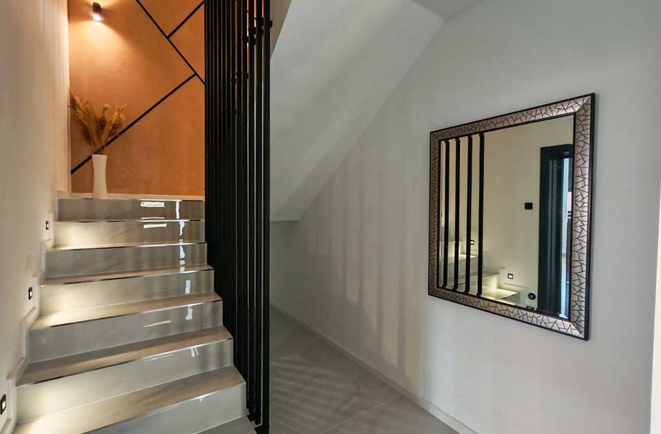 Na spratu se nalaze tri spavaće sobe i kupatilo, kao i apartman to jest soba sa kupatilom. Balkon je površine okvirno 40 kvadrata i obložen je prirodnim kamenom.
