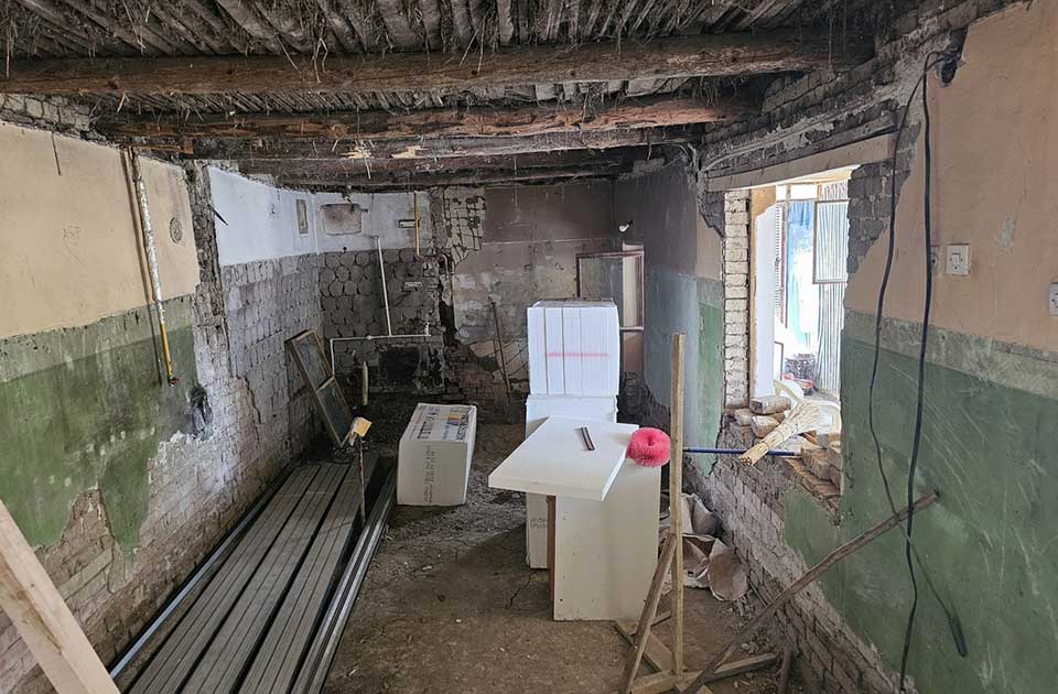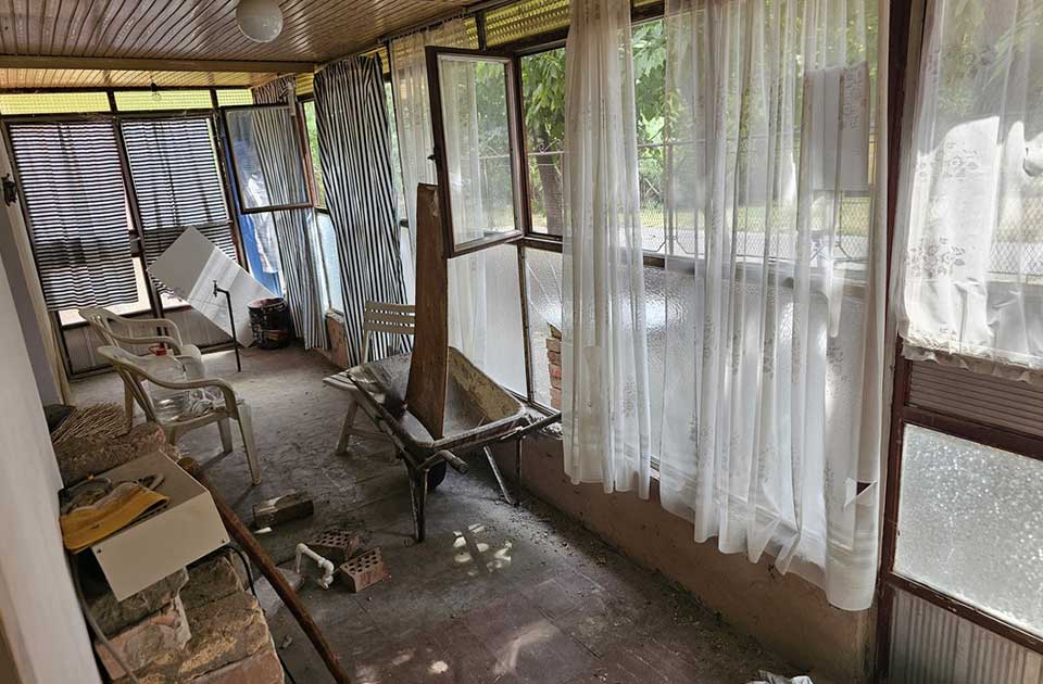 Kuća, koja je u fazi renoviranja, sastoji se od dve sobe, trpezarije i kuhinje koje su zajedno, kao i kupatila.
