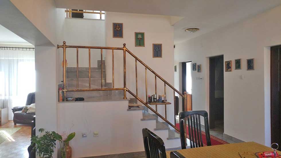 Na spratu se nalazi još jedno kupatilo sa ugradnom kadom i još tri spavaće sobe. Stolarija je drvena sa termopan staklom. Na svim spoljnim otvorima su postavljene drvene žaluzine. Podovi u sobama su parketirani.
