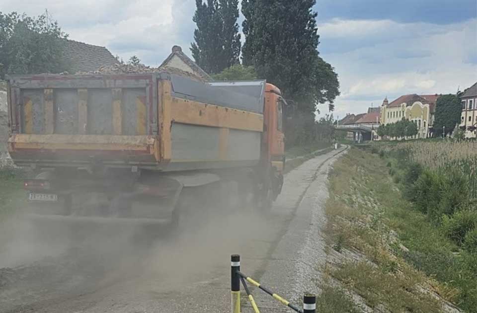 Uskom stazom na obali Begeja teški kamioni prevoze građevinski otpad sa obližnjeg gradilišta.