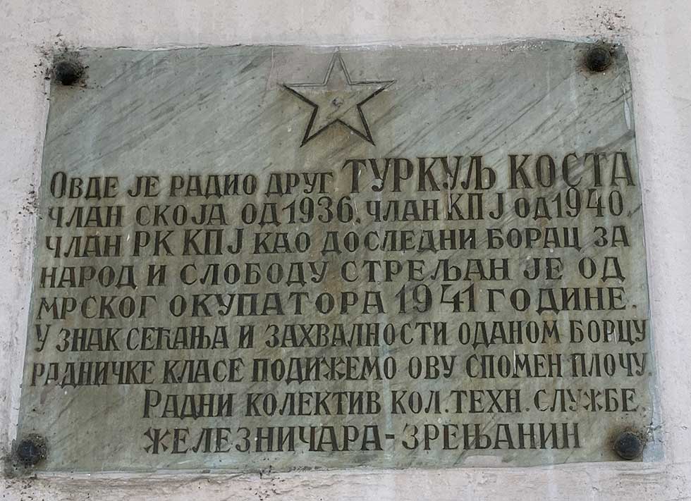 Na zgradi glavne železničke stanice u Zrenjaninu nalaze se dve spomen-table posvećene Kosti Turkulju i Rajku Rakočeviću, odanim borcima radničke klase, koji su dali svoje živote u borbi za slobodu tokom Drugog svetskog rata. Na jednoj tabli piše: „Ovde je radio drug Kosta Turkulj, član SKOJ-a, od 1936. član KPJ, od 1940. član RK […]