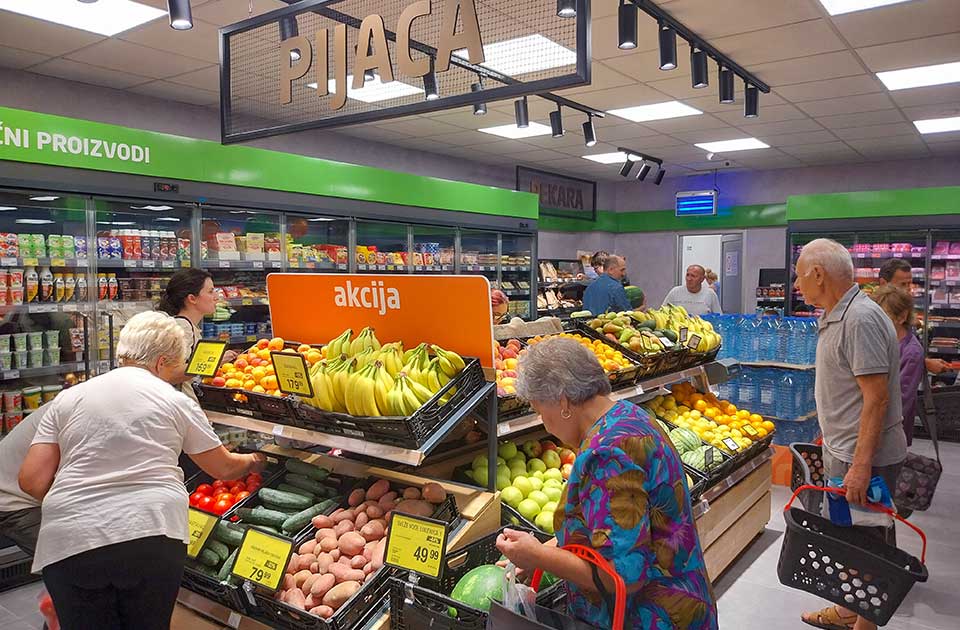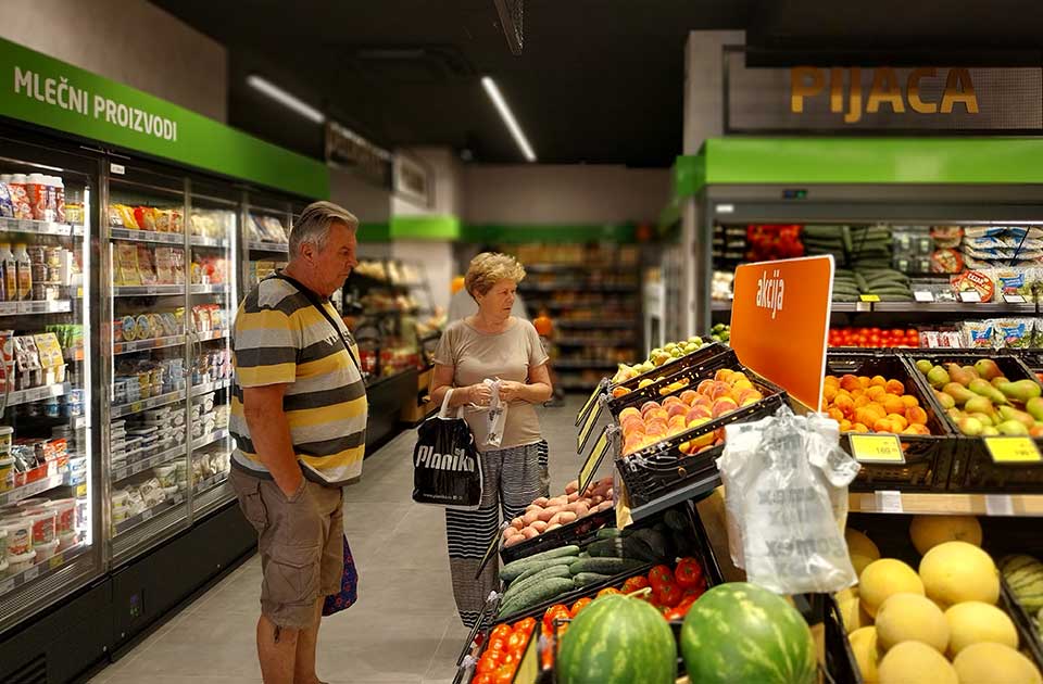 Na ulazu u objekte nalazi se odeljenje sa svežim voćem i povrćem, gde kupci mogu pronaći pažljivo odabrane sezonske proizvode najvišeg kvaliteta.
