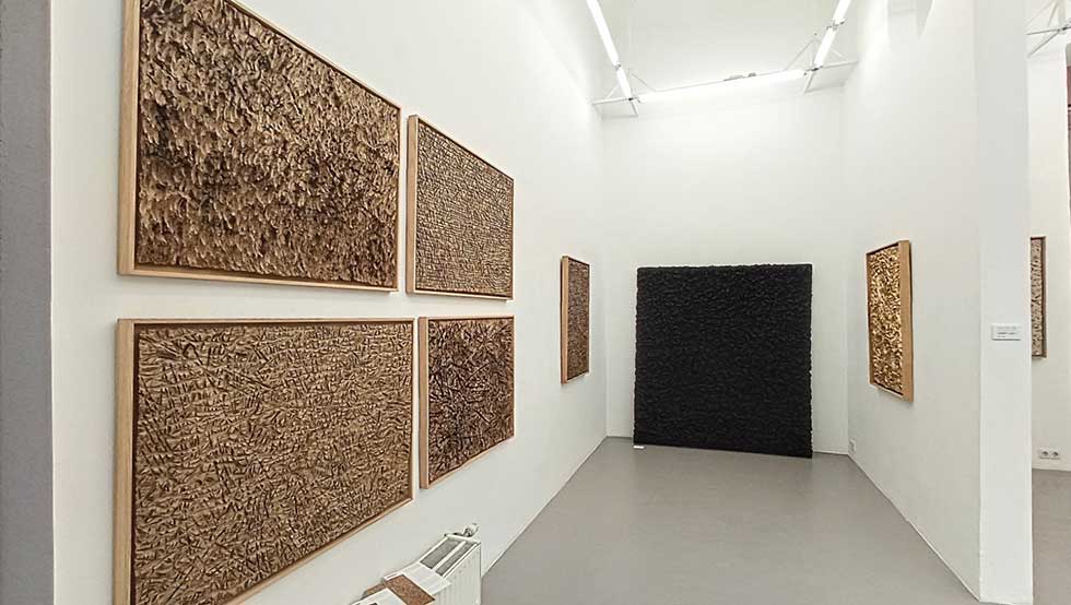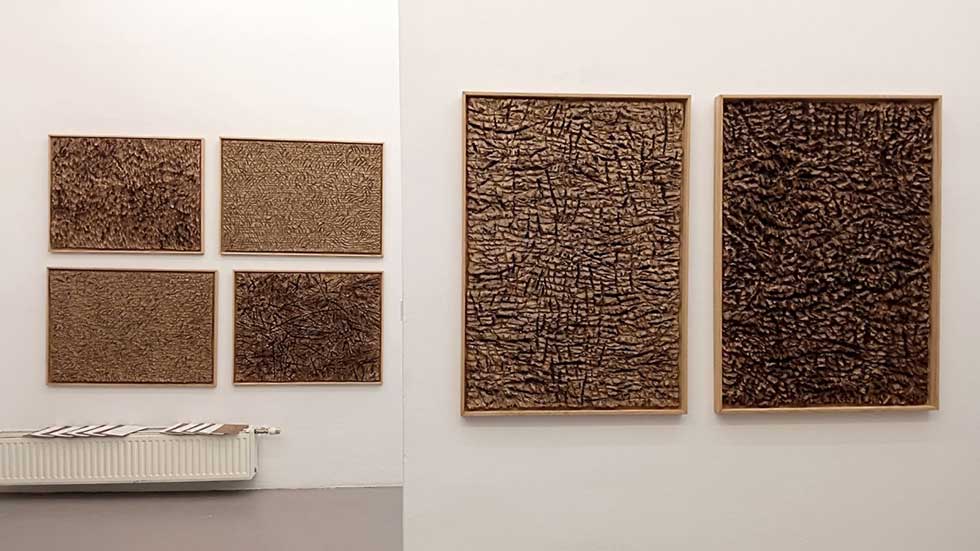 Izloženi radovi nastali su, stoji u katalogu, kroz složeni proces upotrebe prirodnih materijala. Njih umetnica oblikuje služeći se paljenjem, brušenjem, rezanjem, bušenjem. To su slike – objekti sačinjeni od grube papirne kaše kuvane u lepku, vosku, osušene i obrađivane.