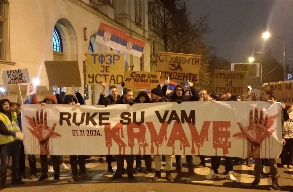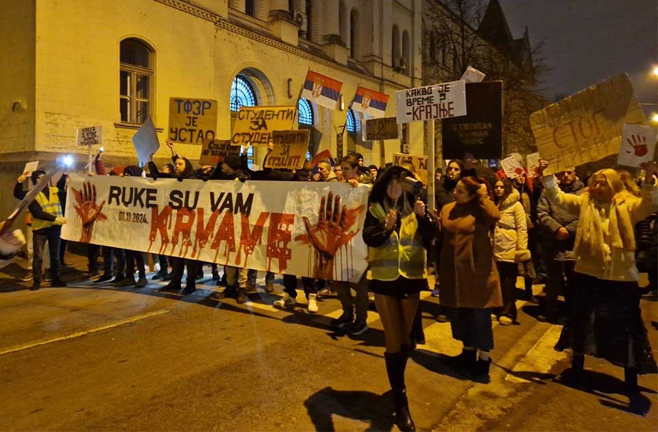 Na večerašnjem protestu u Zrenjaninu okupljeni su nosili transparente s natpisima „Ruke su vam krvave“, „Studenti za studente“, „Tehnički fakultet Zrenjanin je ustao“, „Stali smo jer čekanja više nema“, „Generalni štrajk“, „Kakvo je vreme? Krajnje“…