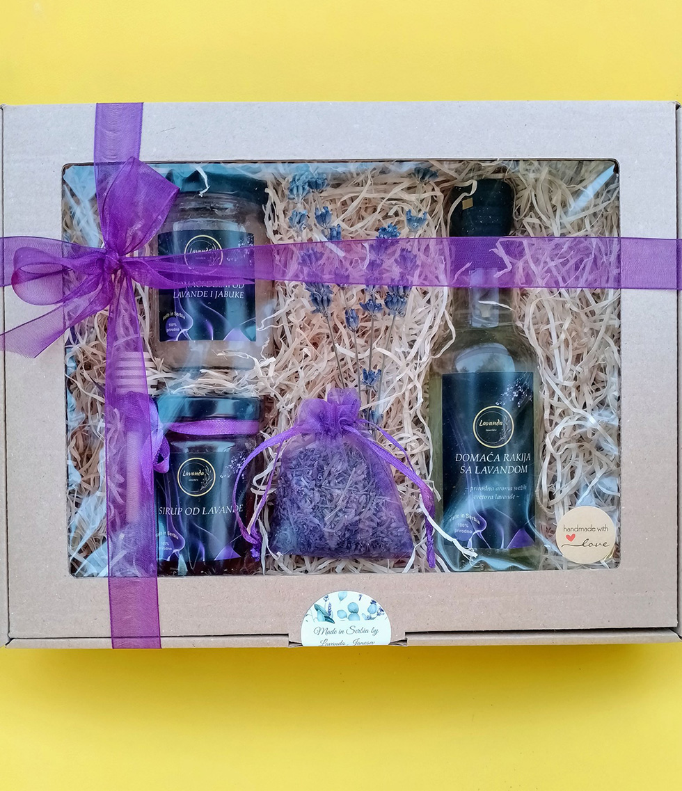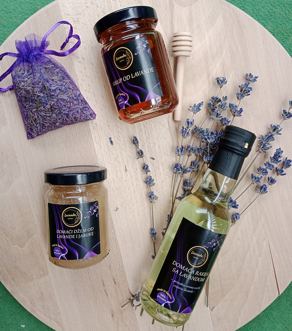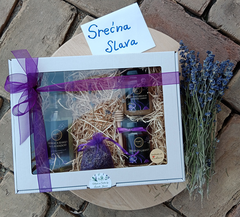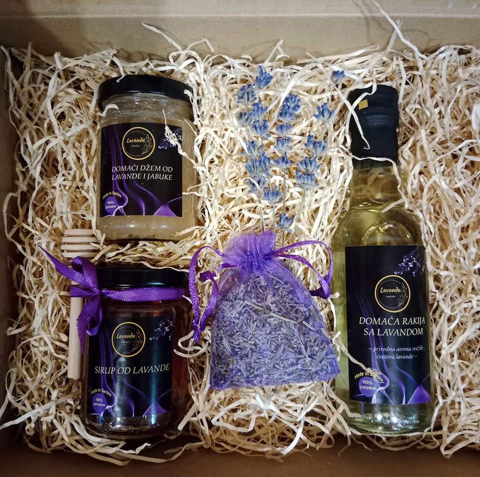 Svi domaći proizvodi nastali u okviru ovog gazdinstva aromatizovani su svežim cvetom lavande i dostupni su u poklon paketu. Neobičan spoj lavande i drugih prirodnih namirnica, upakovanih u atraktivno pakovanje, predstavlja originalnu ideju kao poklon za predstojeće slave, za rođendane i sve specijalne prilike.