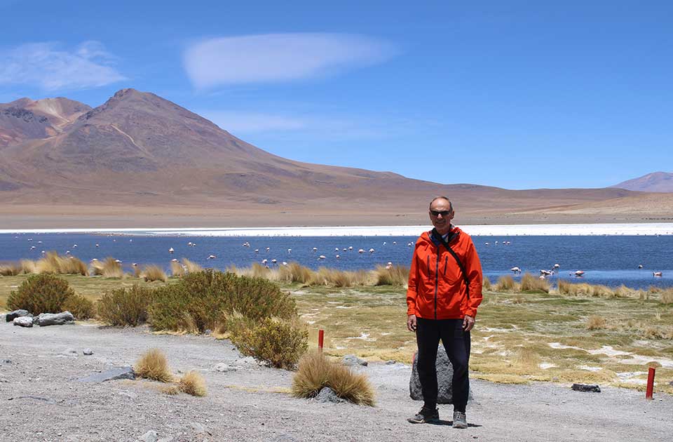 Dve noći spavamo u prenoćištima izgrađenim od soli. Stolovi, stolice, podovi, sve je od soli. Neopisivo iskustvo. Menjamo puknute gume, popravljamo džipove, lutamo, vraćamo se. Tešim saputnike da je u programu pisalo avanturističko a ne turističko putovanje. Da nas podseti na to, slikamo se pored spomenika reli Dakar, pošto se vozimo po predelima gde se vozi čuveni reli. Sve vreme nas kao rendžeri posmatraju vulkanske kupe, ugašene, aktivne. Jedan se puši, kao da daje dimne signale nekome u daljini, da stižu posetioci iz daleka. Ali se jedan posebno izdvaja. Likankabur, visok 5.923 metara, na granici Bolivije sa Čileom. On nas je sve vreme pratio pogledom kroz bolivijsku Veliku slanu pustinju i pustinju Atakamu u Čileu. Kao da je čuvao da ne ugrozimo nestvarnu lepotu slanih laguna i njenih stanovnika, prelepih ružičastih flamingosa.