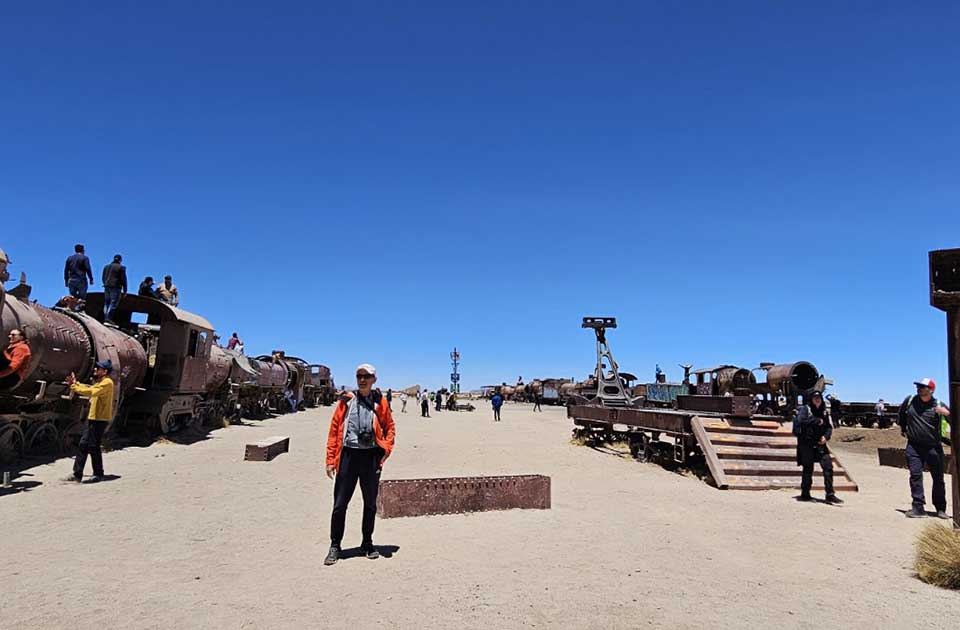 Velika slana pustinja je najveća slana površina na zemlji, veličine oko 10.000 kvadratnih metara, na nadmorskoj visini od 3.760 metara. Već smo nedelju dana na visinama od oko 4.000 metara i potpuno sam se aklimatizovao. Očaran sam nepreglednom belinom oivičenom vulkanskim kupama visine preko 5.000 metara. Nestvarni, gotovo nadrealni prizori na sve strane. Groblje vozova na toj visini, u oblacima, deluje kao fatamorgana. Kao na traci nižu se čudesni prizori. Polje sa gejzirima koji se sablasno puše u svitanje, ostrvo kaktusa, bazeni sa toplom vodom, kamene formacije kao skulpture u dolini Salvadora Dalija, lagune sa slanom vodom, Kolorada, Verde, Hedionda… prepune ružičastih flamingosa koji se u njima gnezde, krda gvanaka koji brste oskudne žbunove u pustinji.