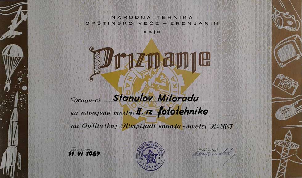 – Fotografija je ušla u moj život jako rano, zahvaljujući foto sekciji koju smo imali u osnovnoj školi. Priključio sam se toj sekciji u višim razredima, a baš sam skoro pronašao diplomu za osvojeno drugo mesto na takmičenju koje je 1967. godine organizovala Narodna tehnika. U školi smo imali i kompletnu laboratoriju, pa sam naučio ceo proces izrade fotografije. Tada sam imao, kao i svi u to vreme, fotoaparat „Smena 8“, mada smo mi u kući imali neki stari fotoaparat „Krokus“ kojim, koliko se sećam, niko nije fotografisao – priča Milorad Stanulov za naš portal.