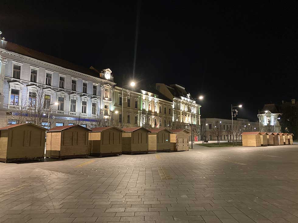 Na centralnom trgu zatvorene drvene kućice. Na klupama nikoga. Otac sa detetom nakratko zastaje da pogleda panoe.