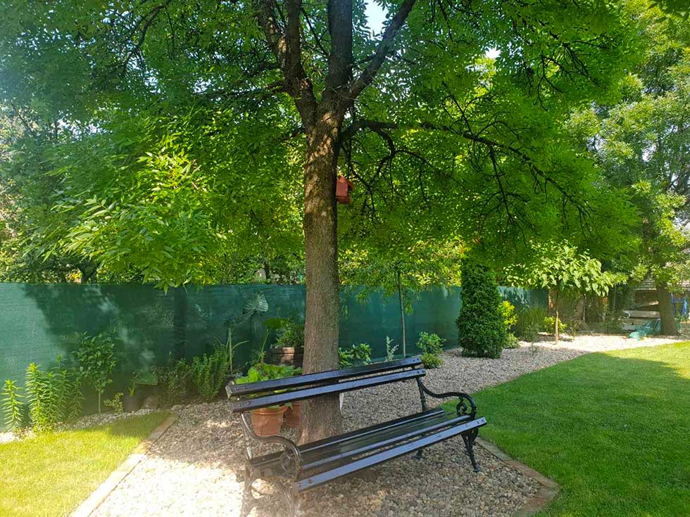 – Tu je drvena senica, ali i mesto za vežbanje pod jasenom. Klupa pod krošnjom. Sviđa mi se kako izgleda japanski vrt, pa pošto ne mogu da u Banatu napravim japanski vrt, napravila sam jedan njegov delić. Bašta živi svoj život tokom cele godine i uvek je lepa. U proleće su tu zelenilo, cveće i travnjak, tokom leta hlad koji stvara veliko drveće, a i jesen ima svoje čari – navodi Mira.